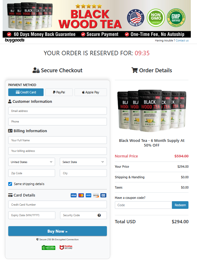 Black Wood Tea is backed by a 100% money back guarantee, 90 full days from your original purchase. If you’re not totally and completely satisfied with the product, your results or your experience in the first 90 days simply let us know by calling our toll free number or dropping us an email and we’ll give you a full refund within 48 hours of the product being returned. That’s right, simply return the product, even empty bottles, anytime within 90 days of your purchase and you’ll receive a full, no questions asked refund.